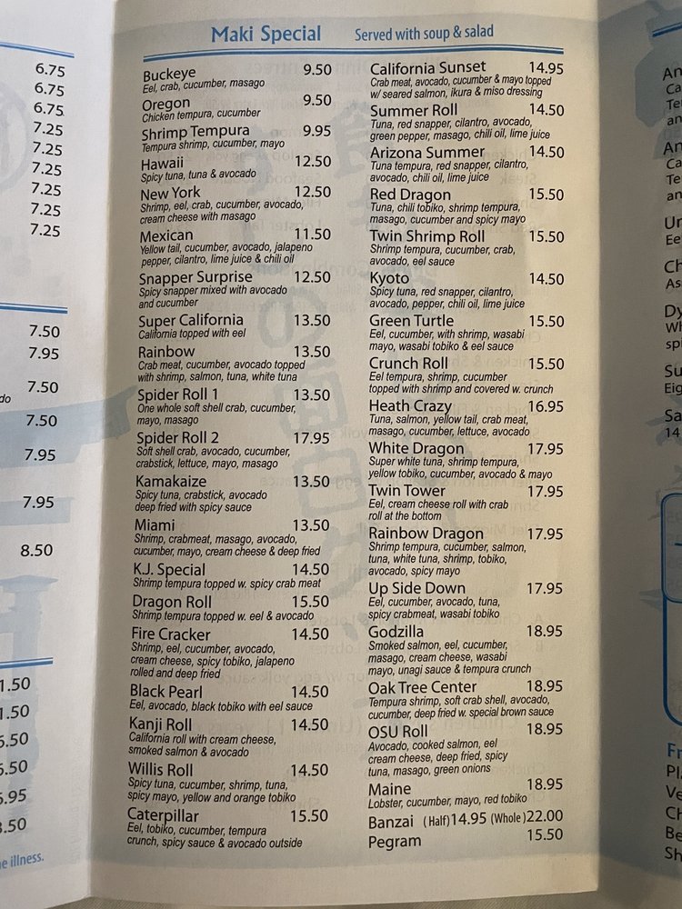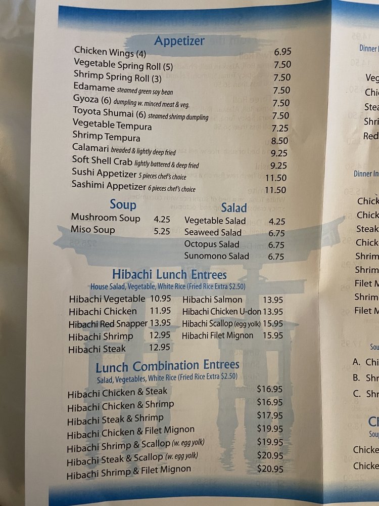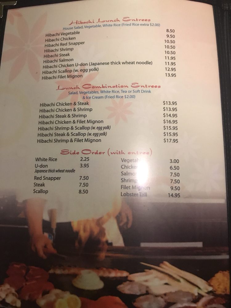 Introducing the menu at Kanji Japanese Steakhouse, a popular spot in Heath, OH, that offers a range of delicious Japanese dishes. From appetizers like Gyoza and Shrimp Tempura to dinner combinations like Steak & Shrimp Combo and Filet Mignon & Lobster Tail Combo, there's something for everyone. Don't miss out on their flavorful fried rice options, including Chicken Fried Rice and Shrimp Fried Rice. Customers rave about the quality of food and service, with many highlighting the friendly staff and cozy atmosphere. Whether you're in the mood for sushi or hibachi, Kanji Japanese Steakhouse promises a delightful dining experience worth revisiting.